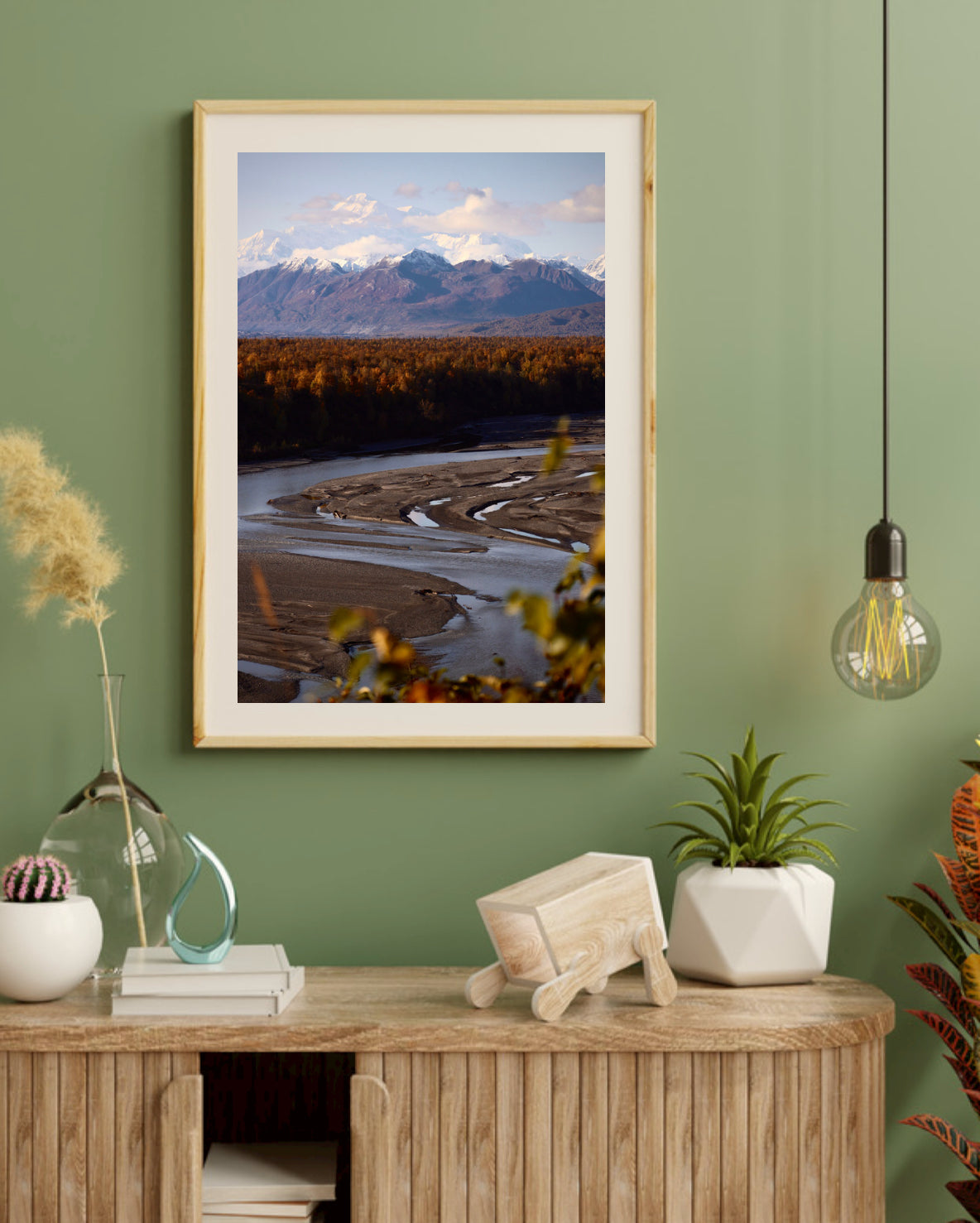 The Chulitna River winds its way amongst autumn leaves below the tallest mountain in North America... Denali. The High One, as photographed from within Denali State Park, Alaska.