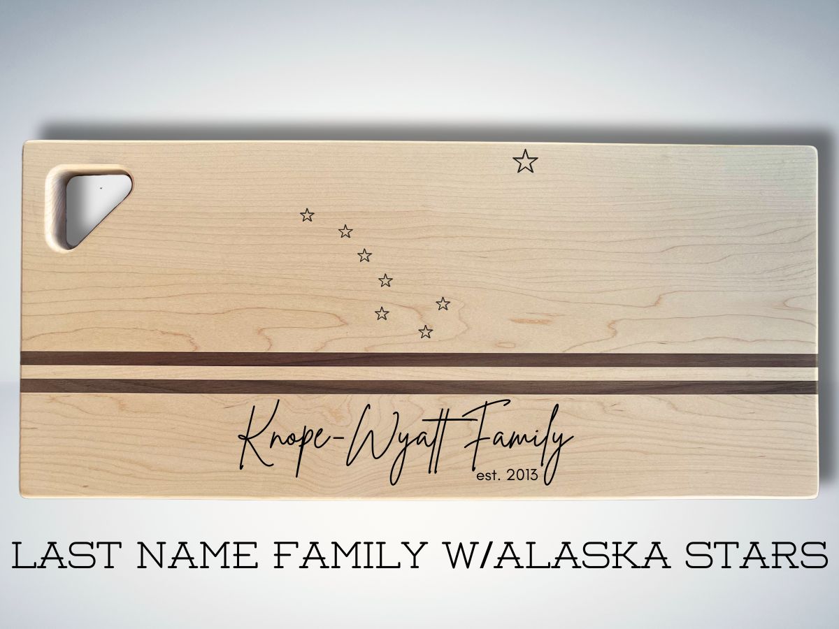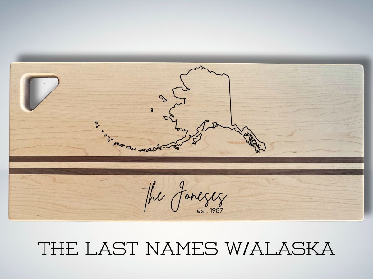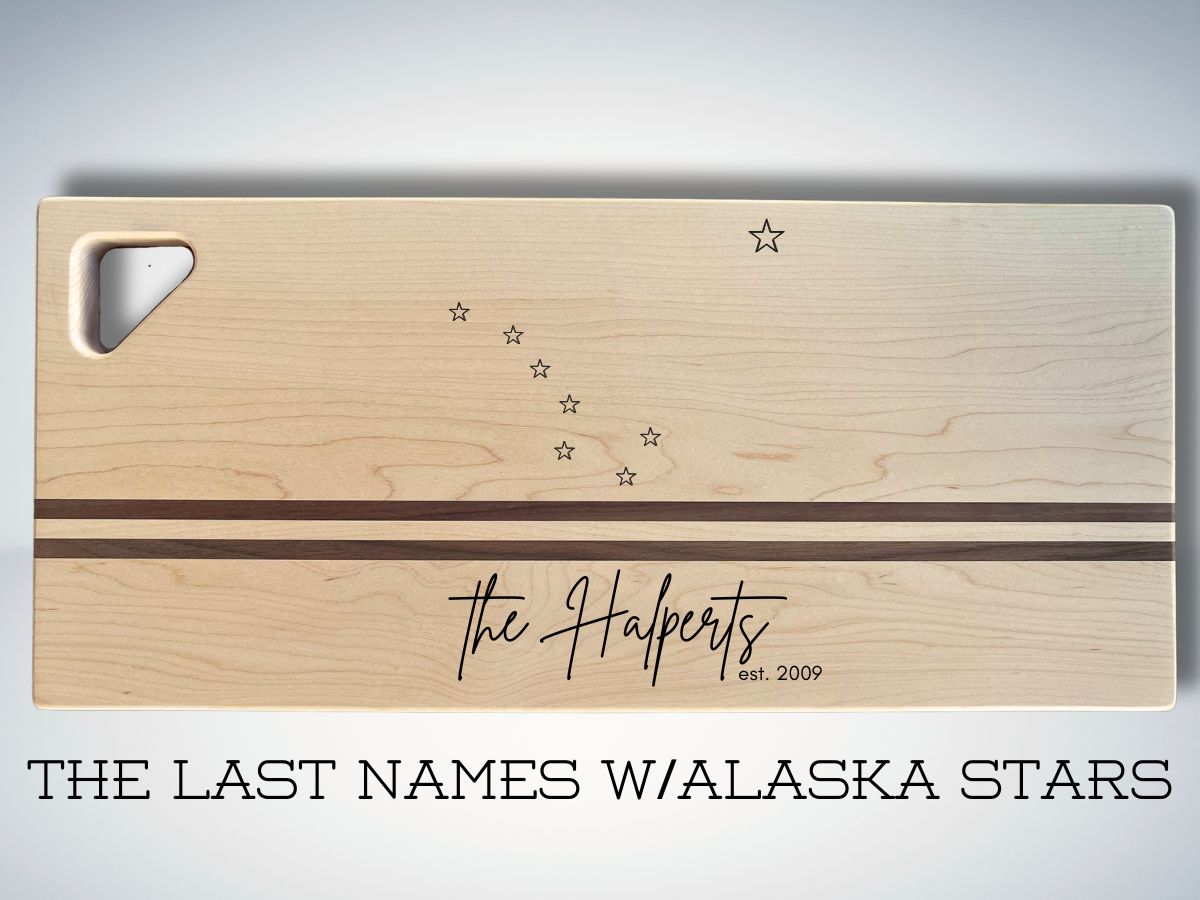 Our handmade Alaskan charcuterie & serving boards make the perfect addition to your next gathering! Each board is crafted start to finish in our home - attention to detail shines through in each step of the process, from the hand-routed edges to the multiple applications of food-grade finish.